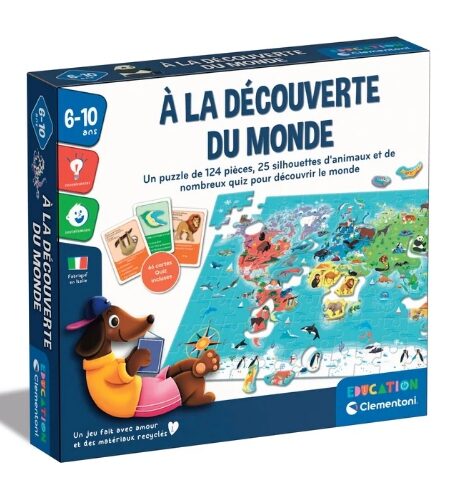 Le coffret contient un puzzle à reconstituer, représentant un planisphère avec les principaux reliefs, les silhouettes des animaux et des images de la végétation typique des différentes régions.
