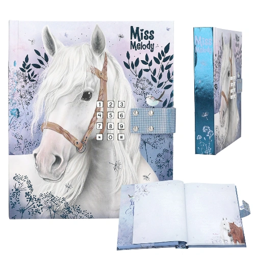 Pour tes pensées et tes rêves secrets : la couverture de ce journal intime de Miss Melody dans de superbes tons bleus et avec une finition brillante présente un magnifique motif cheval et des imprimés élégantes de fleurs et de feuilles. Le journal intime s’ouvre uniquement à l’entrée du bon code à 4 chiffres (à choisir et à changer par toi-même). En même temps, le méga tube « Wildest Dreams » de Taylor Swift sera déclenché et jouera pendant env. 20 secondes. L’intérieur du journal comporte 80 pages finement lignées et joliment illustrées.