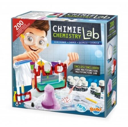 Inclus : 1 bécher, 1 éprouvette, 1 fiole, 3 tubes à essai, 3 bouchons, 1 bouchon avec trou + 1 tube flexible, 3 boîtes de Petri, 1 cuillère bleue, 1 cuillère jaune, 1 pince, 1 loupe, 1 thermomètre, 1 pipette, 1 goupillon, 1 ficelle, 1 ballon, 2 pailles, papier filtre, lunettes de protection, papiers pH.