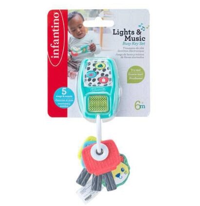 4 boutons faciles à appuyer pour diffuser de vrais sons et musiques de voiture Le porte-clés lumineux favorise l’engagement visuel Breloque tigre froissé Contrôle parental activé/désactivé Batteries incluses Âge suggéré à partir de 6 mois Les bébés adoreront imiter leurs parents avec leur premier jeu de clés de jeu d’imitation ! Sans danger pour les bébés et approuvé pour les bébés, cet ensemble de clés réalistes comprend une variété de matériaux sans BPA, idéaux pour favoriser le développement de la motricité globale et précoce. Appuyez sur les boutons pour activer les lumières et les vrais sons de la voiture