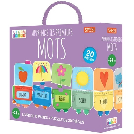Un livre de 10 pages et un puzzle de 20 pièces géantes pour créer un petit train et apprendre les premiers mots.