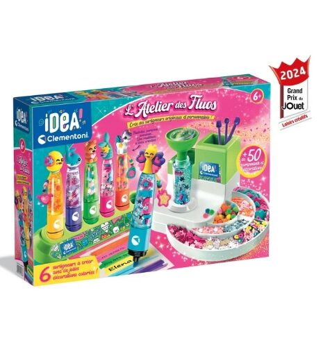 Le coffret contient une base pratique pour réaliser facilement tes créations, un entonnoir, des embouts, de l’encre, des personnages, des paillettes et tous les accessoires nécessaires pour réaliser de magnifiques fluos !