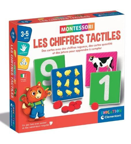 Ce jeu, inspiré de la méthode Montessori, est basé sur la perception tactile : les cartes à finition rugueuse permettent à l’enfant de mémoriser la forme des chiffres par le toucher.