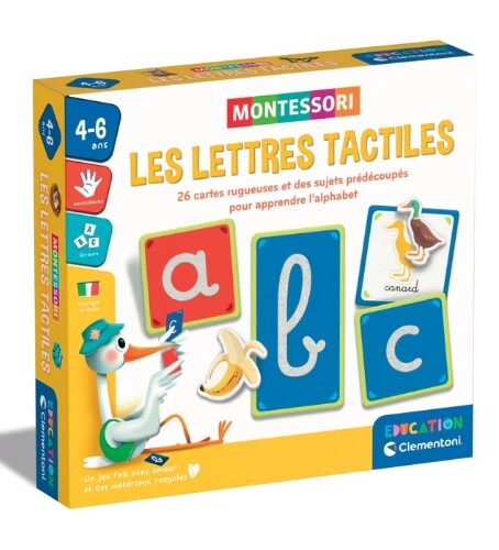 Ce jeu, inspiré de la méthode Montessori, est basé sur la perception tactile : les cartes à finition rugueuse permettent à l’enfant de mémoriser la forme des lettres par le toucher.