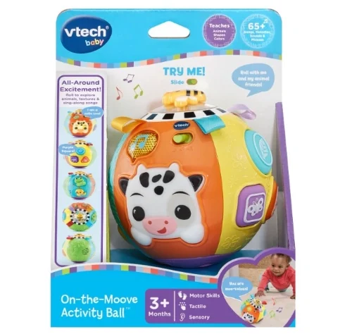 Grâce à ses 3 boutons souples et son détecteur de mouvement, cette balle stimule la motricité globale et fine tout en amusant votre enfant avec des anecdotes, des chansons et des sons amusants. Le jouet est équipé de lumières, de textures variées et d’une vache souple et lumineuse qui captivent l’attention de bébé tout en favorisant son éveil.
