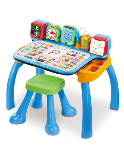 Mini tableau blanc intégré, horloge pédagogique, roue des couleurs et cadre photo.