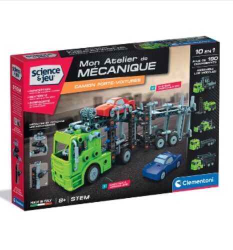 Un coffret de construction incroyable permettant d’assembler un camion porte-voitures et deux petites voitures.