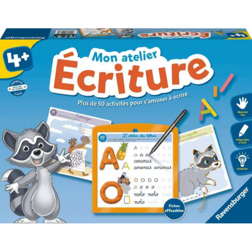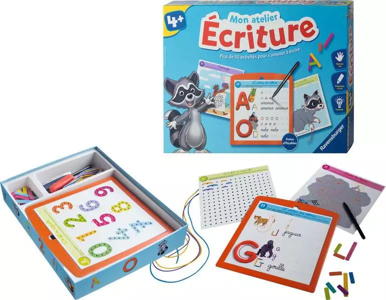 Mon atelier Ecriture rassemble dans un coffret inédit plus de 50 activités, ludiques, originales et créatives, pour initier l’enfant aux gestes de l’écriture : des lacets à enfiler dans des planches à trous pour développer sa motricité fine, des activités de graphismes (points à relier, motifs à reproduire, lignes à suivre) pour apprendre le geste graphique et le maniement du feutre ou du crayon sans lever la main.