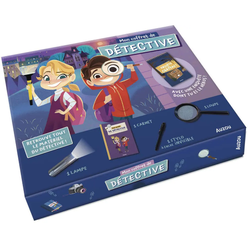 Un coffret complet pour devenir un grand détective ! Avec ton matériel, enquête et résous l’énigme de ton escape book ! Inclus : une loupe, un encrier, une lampe, un stylo à encre magique, un carnet de détective de 80 pages et une enquête dont tu es le héros à résoudre !