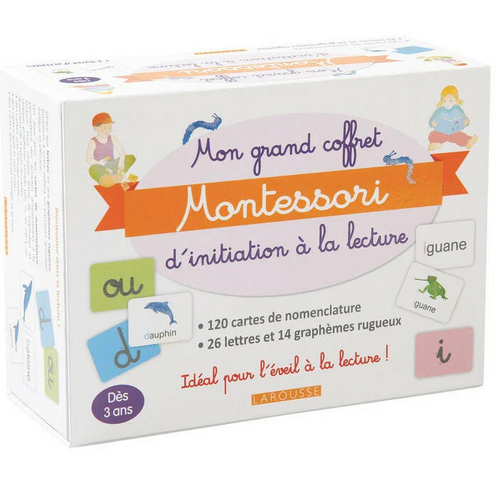 Ce coffret propose une entrée dans la lecture grâce à deux fondamentaux de la pédagogie Montessori : les lettres rugueuses et les cartes de nomenclature. Les lettres rugueuses permettent un parcours sensoriel où l’apprentissage est actif : chaque lettre a une dimension visuelle, tactile, auditive. Grâce à la répétition des gestes l’enfant mémorise chaque lettre et son tracé et gagne en confiance. Les jeux avec les cartes de nomenclature sont autant d’activités préparatoires à la lecture. Nous proposons 3 types de cartes pour chaque lettre de l’alphabet ainsi que pour une série de graphèmes simples ( on, in, oi, etc.) :