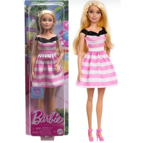 Célébrez le 65e anniversaire de Barbie avec cette poupée Barbie commémorative ! Elle porte une robe à rayures roses et blanches ornée d’un nœud noir au niveau du décolleté. Des boucles d’oreilles nacrées et des talons roses complètent son look classique ! Cette poupée est un cadeau idéal pour les enfants et les fans de Barbie de tous âges