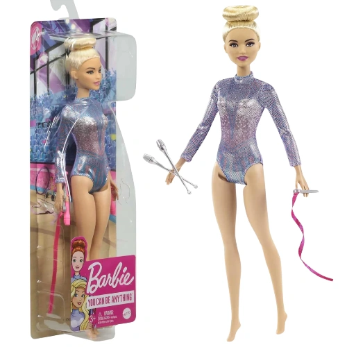 - Vêtue d’un justaucorps métallique coloré et coiffée d’un joli chignon, la poupée Barbie® gymnaste rythmique (30,40 cm) est prête à exécuter des mouvements de gymnastique rythmique !