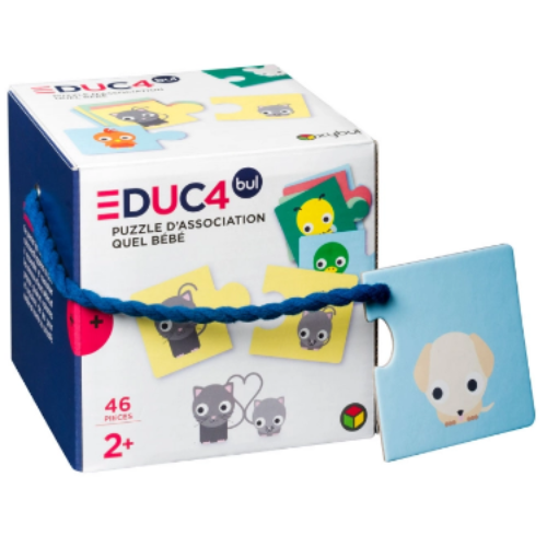 Puzzle d’association A qui est bébé ? Avec ce premier puzzle d’association A qui est bébé ? votre enfant va pouvoir développer son langage et regrouper les cartes, paire par paire, pour associer chaque animal avec son bébé. La découpe des pièces incite à l’auto-correction, favorisant la mémorisation et l’apprentissage chez l’enfant, sans jamais manquer d’éveiller sa curiosité ! Pour des parties plus endiablées, le jeu peut se pratiquer à plusieurs ! Caractéristiques techniques : 46 cartes en carton. Dim. d’1 carte : 8 x 8 cm.