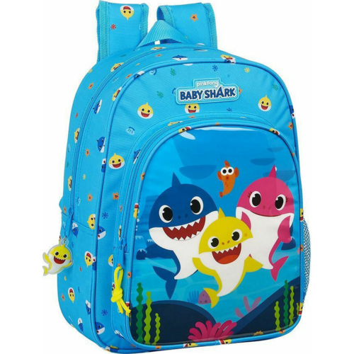 Cartable à porter sur le dos, adapté aux enfants de maternelle, de Safta, avec un thème Baby Shark en bleu clair.