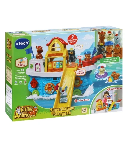 La cabine du bateau peut se détacher pour se transformer en maison et le bouton lanceur permet de faire glisser les animaux sur le toboggan ! L’enfant tire sur la cordelette pour faire rouler le bateau et déclencher des mélodies.