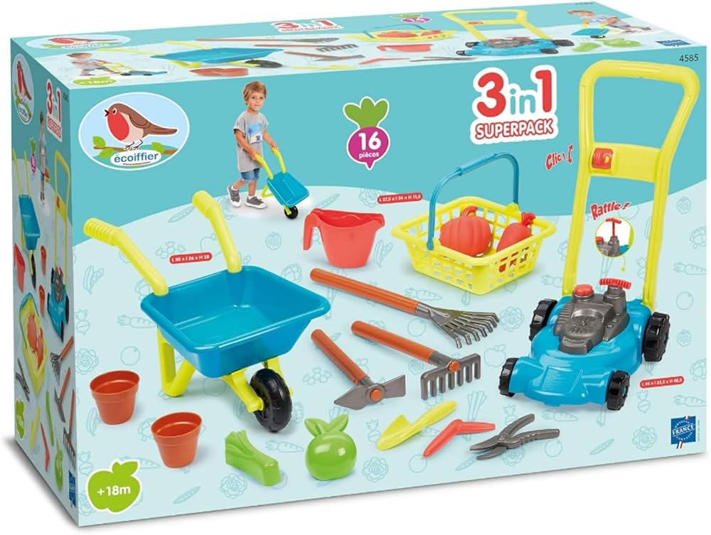 POUR TOUT FAIRE AU JARDIN : votre enfant aura une panoplie d’outils réalistes pour accomplir les 3 tâches les plus courantes au jardin : tondre la pelouse, faire des plantations et transporter de la terre ou des feuilles.